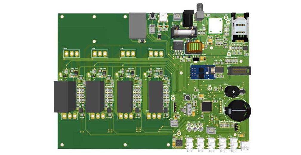 This device has many features like an RF receiver (315/433MHz), five Analog inputs, a GSM modem, working by either AC/DC adaptor or Li-ion Battery (with charger), connecting to the PC using USB/Wifi for adjusting the settings, Updating firmware, measuring RMS AC voltage and current for each output (measuring power consumption up to 3.3kWh), connecting a character LCD, NOR-Flash (for saving events, measuring parameters, and settings).